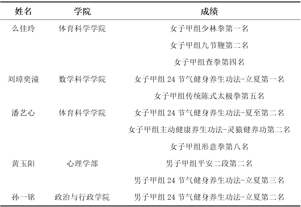 本届赛事共有241所院校1200余名运动员参赛,创参赛人数历史新高。国产亚洲精品美女久久久_99久无码中文字幕一本久道_亚洲成AV人影院_亚洲AV影院一区二区三区 狠狠躁夜夜躁人人爽天天不卡_国产激情久久久久影院老熟女_精品性高朝久久久久久久武术队经过层层筛选,选派么佳玲(体育科学学院)、郭良佼(体育科学学院)、潘艺心(体育科学学院)、杨耀翔(体育科学学院)、刘璋奕潼(数学科学学院)、孙一铭(政治与行政学院)、黄玉阳(心理学部)、杨利伟(化学学院)8名运动员参加少林拳、查拳、形意拳、九节鞭、剑术、健身功法、集体器械等诸多项目的竞赛,经过激烈角逐,我校武术队共收获2金5银1铜、1个第四名、1个第五名、1个第八名的优异成绩。
