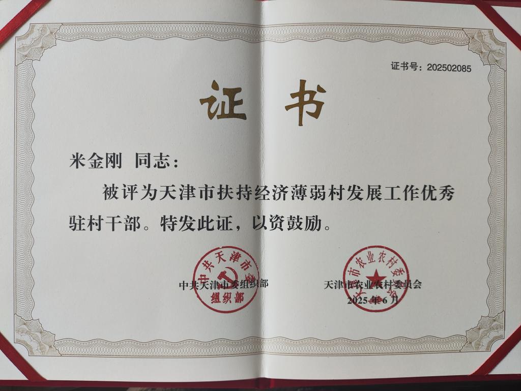 本站讯(通讯员 徐可)近日,中共天津市委组织部、天津市农业农村委员会对在扶持经济薄弱村发展和乡村振兴示范村创建工作中表现突出的先进集体与个人进行表彰。我校驻蓟州区东施古镇南小逯庄村驻村干部米金刚同志荣获“天津市扶持经济薄弱村发展工作优秀驻村干部”称号。
