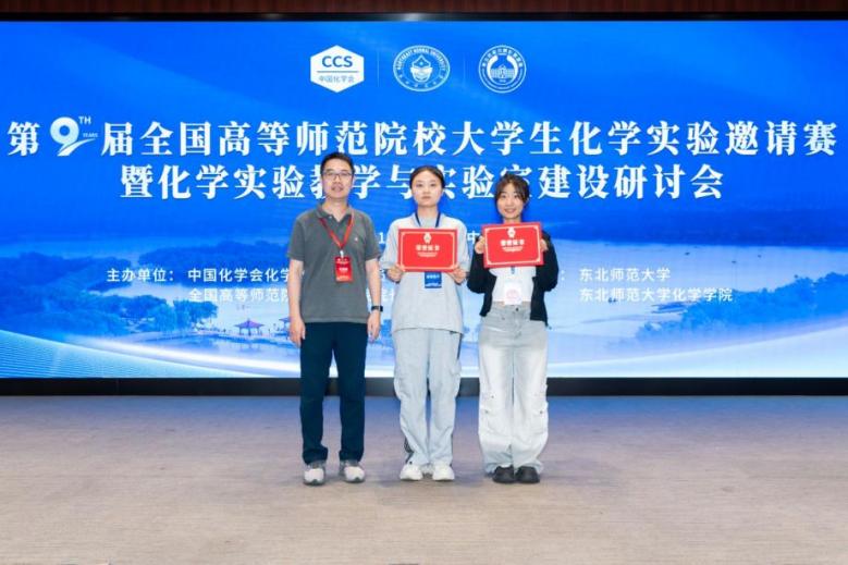 本站讯(通讯员 李小轩)日前,第九届全国高等师范院校大学生化学实验邀请赛在东北师范大学举行,我校化学学院化学师范专业2022级学生杨璐、高冉,在副院长朱柏林带领下参赛。经过实验操作与笔试两个环节的激烈角逐,两位同学均取得大赛一等奖的佳绩 。