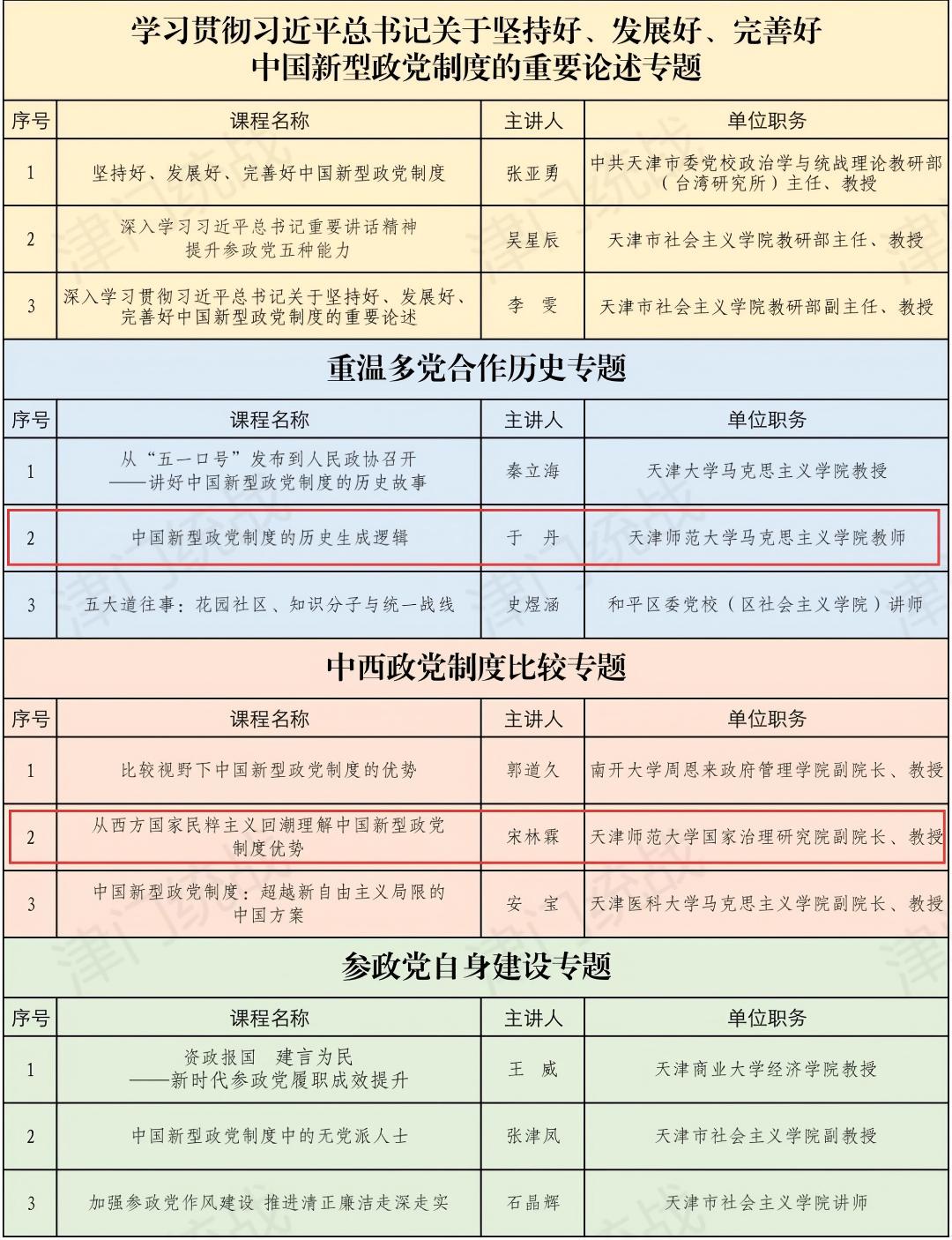 本站讯(通讯员 田广)近日,天津市委统战部会同市社会主义学院开展的“中国新型政党制度”精品课建设工作圆满落幕。此次建设工作旨在深入学习贯彻习近平总书记关于做好新时代党的统一战线工作的重要思想,贯彻落实习近平总书记关于坚持好、发展好、完善好中国新型政党制度的重要论述,形成既有理论性又有实践性的中国新型政党制度课程体系,为各民主党派、无党派人士加强思想政治建设提供课程载体,为各级党员干部开展民主党派、无党派人士工作提供理论支撑。经过严格评选,从全市56个申报课程中脱颖而出的12个精品课程名单正式揭晓,我校有两门课程成功入选。