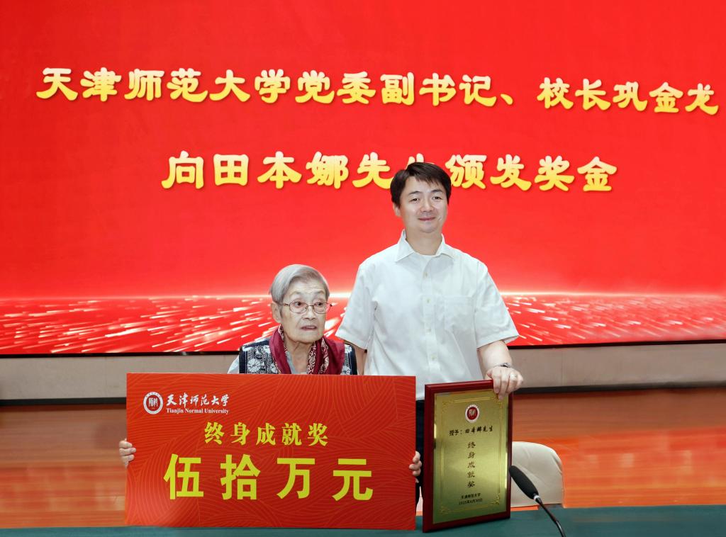 曲凯、巩金龙分别为田本娜先生颁发“终身成就奖”奖牌和50万元奖金。田本娜先生对学校给予的荣誉和奖励以及与会专家的高度评价表达感谢,现场宣布将奖金全部捐赠给学校以奖励优秀教师和学生,并向学校捐赠珍贵论著与手稿。