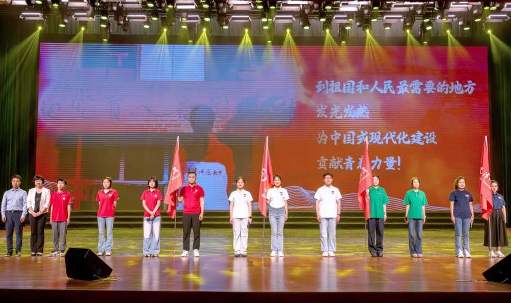 向光而行,筑梦领航。2025年全国先进工作者、全国优秀教师、天津市第四中学党委书记、我校杰出校友代表安媛,全国优秀教师、全国最美思政课教师、我校马克思主义学院副院长王雪超为国家公费师范生、第27届研究生支教团、2025年西藏专项计划基层工作者、国际中文教育志愿者等即将投身教学一线、扎根基层服务的2025届优秀毕业生代表佩戴校徽并授旗寄语,勉励广大学子始终铭记“勤奋严谨 自树树人”校训精神,立报国强国大志向,做挺膺担当奋斗者,到祖国和人民最需要的地方发光发热,为中国式现代化建设贡献力量。