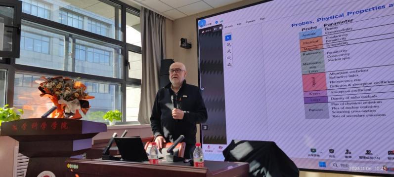会见后,乌尔曼教授在数学科学学院报告厅作主题为“Inverse Problems and Harry Potter's Cloak”的学术报告。乌尔曼教授通过列举测量到达视网膜的散射光,大脑构建了周围世界的地图等具体案例,佐证反问题几乎出现在所有科学和技术领域,通过求解反问题,可以获得关于世界的大部分信息。他还列举了声呐探测、无损检测、医学成像及地球物理勘探等不同背景下出现的反问题现象,以“哈利波特的斗篷”为例引入反问题的另一重要应用——隐形,并简单描述了如何利用变化光学实现隐形。