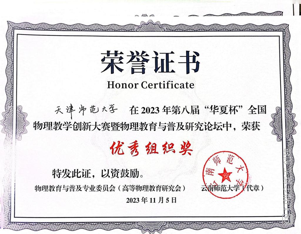 物理与材料科学学院消息(通讯员 郝健强 刘通)近日,第八届“华夏杯”全国物理教学创新大赛暨物理教育与普及研究论坛在云南师范大学举行。经过紧张激烈的比赛,物理与材料科学学院2021级物理师范生施芷妍、刘睿祺、李雅杰表现出色,均斩获一等奖。其中,施芷妍同时获得“实验创新奖”,并获推参与创新教学大赛优秀作品展示。我校荣获“优秀组织奖”。