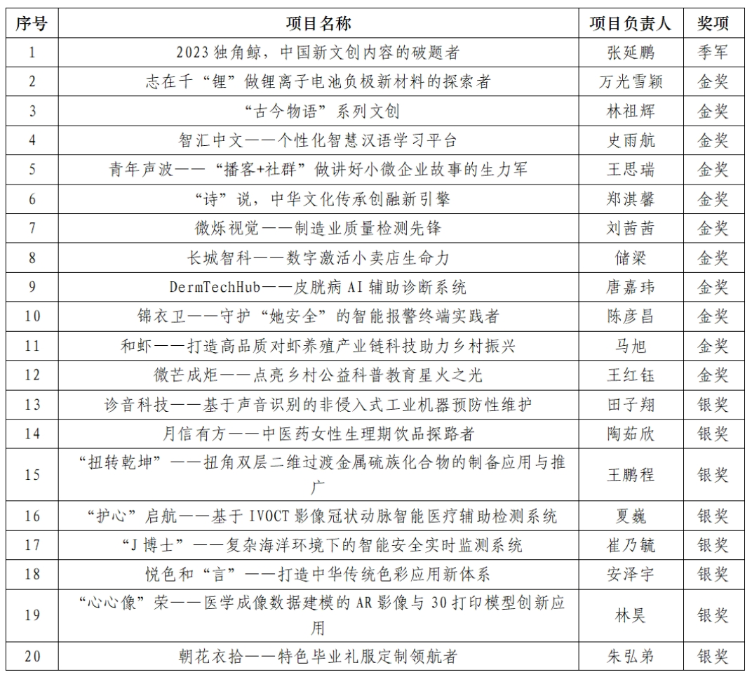 教务处消息(通讯员 李倩)近日,第九届中国国际“互联网+”大学生创新创业大赛天津赛区组委会发布了本届天津赛区赛事获奖名单,我校“2023独角鲸,中国新文创内容的破题者”项目团队获得季军,这是我校在历届天津赛区比赛中的最佳成绩,此外另有44个项目获得了金奖11项、银奖15项、铜奖18项。“2023独角鲸”等6个项目入围全国总决赛。