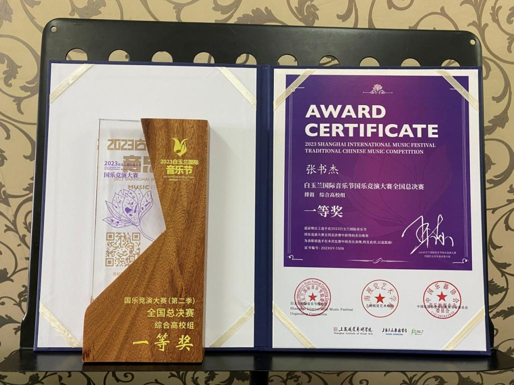 在2023白玉兰国际音乐节国乐竞技大赛中,音乐与影视学院2022级打击乐专业学生张书杰发挥出色,在全国总决赛排鼓组中取得“综合高校”一等奖的好成绩,王静荣获“优秀指导教师”奖。