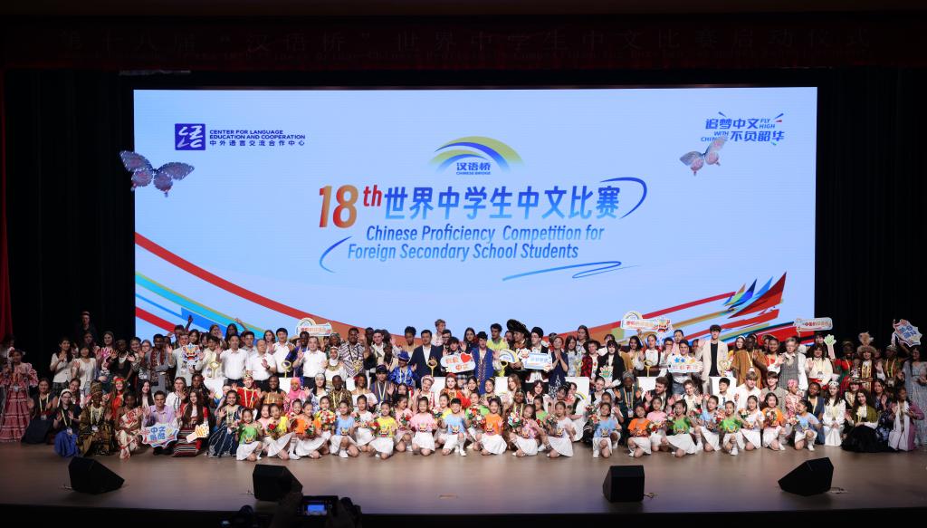 开幕式上,30名天津青少年以清脆嘹亮的歌声真情演唱了今年上合峰会期间唱响的《我在天津等你》。优美的旋律勾勒出天津的四季景致与地域文化符号,满腔热忱欢迎世界各地青少年的到来。传统与现代科技交融的表演《字脉千年》,通过人机组合联动,将传统舞蹈与律动欢快的查尔斯顿舞巧妙结合,呈现出传统与现代的美妙融合,象征着中华文化在数智时代跨越疆界,促进语言互通、理解互信、文明互鉴的美好愿景。开幕式现场,嘉宾同五大洲选手代表共同上台手持开启未来的“金钥匙”,一同开启语通未来的“文化之门”,第十八届“汉语桥”世界中学生中文比赛正式拉开序幕。