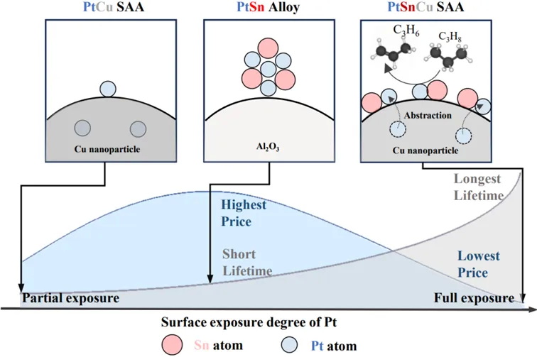 在传统催化剂中,贵金属原子易聚集成较大颗粒,导致大量原子埋藏在颗粒内部,无法参与表面反应,催化效率在低位徘徊。这一问题在丙烯生产的关键工艺,丙烷脱氢中尤为突出。丙烯是世界上产量最大的化工品之一,是塑料、橡胶、纤维、医药等领域重要的基础原料,2024年中国丙烯产量占全球总产量三分之一,总产值超过6000亿元人民币。丙烷脱氢生产中约有高达三分之二的工艺采用贵金属催化剂,但传统催化剂依赖稀缺贵金属、原子利用率低,严重制约了行业可持续发展。