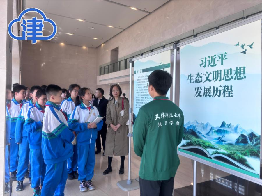 在会场外,一场别开生面的地理实践探索同步展开。天津市汇文中学的师生们在地理学部志愿者的引导下,开启了生态文明与科学探索的双重体验之旅。走近习近平生态文明思想展,一幅幅图文并茂的展板生动展现了我国生态文明建设的辉煌成就。汇文中学的师生们驻足观看,认真聆听志愿者讲解“绿水青山就是金山银山”的理念内涵。在环境中,观察记录着人放天养的校园精灵们的生活习性、行为模式,亲身感受人与自然和谐共生的生态校园。在水资源与水环境实验室内,汇文学子化身“小小科学家”,戴上实验手套,手持专业采样瓶,在志愿者指导下采集校园景观湖水体样本,并在实验室中亲身体验水质监测、粗盐提纯实验。这场跨越展厅与实验室的实践课堂,让生态文明理念从文字跃入现实。