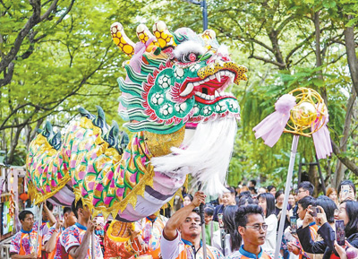 近日,泰国博仁大学与海上丝路孔子学院等机构共同举办春节联欢会暨中国文化节活动。图为当地民众表演舞龙。