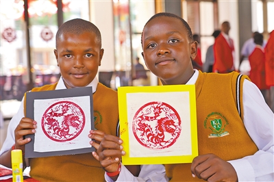 近日,肯尼亚内罗毕大学孔子学院举办2024“欢乐春节之龙腾鼓跃闹新春”活动。图为学生展示木版年画作品。
