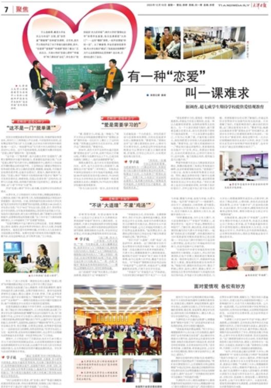 面对当下社会中出现的婚恋现实问题,我市不少高校积极构建和完善婚恋教育体系,加强恋爱心理教育、家庭伦理教育,提升学生表达、沟通和交往能力,引导学生树立正确的爱情观、婚恋观、家庭观等,颇受学生欢迎,同时也助力培养健康身心、健全人格,让学生学会保护自己、尊重他人。