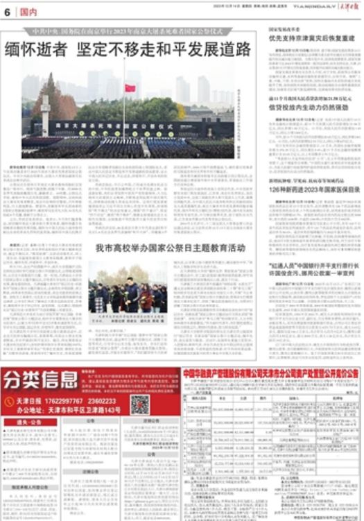 在天津医科大学举行的国家公祭日教育活动中,百余名天医师生胸戴白花,表情肃穆,向南京大屠杀死难者默哀,并齐声诵读《和平宣言》。随后,师生观看南京大屠杀相关纪录片;该校护理学院学生带来短剧《1937》;学校关工委教师章军凤以“传承红色基因 赓续红色血脉”为题举办讲座,寄语同学们“缅怀历史,传承爱国精神。勿忘历史,吾辈自强。”