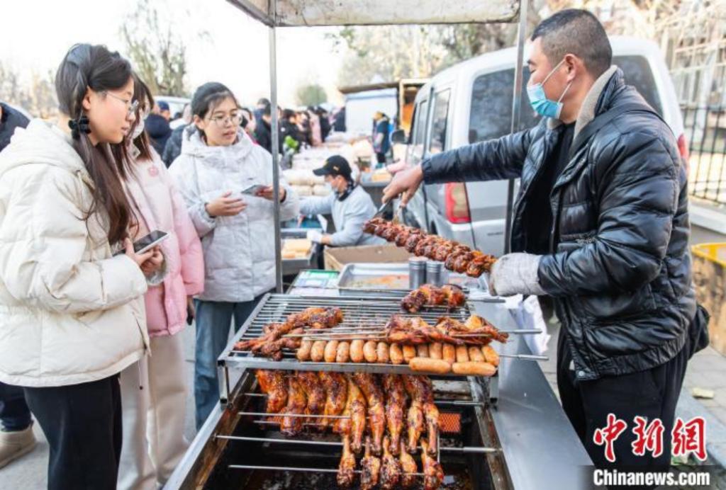 12月3日上午,来自天津城建大学的三位大学生正在“姚村大集”上购买烤鸡腿。 王在御 摄