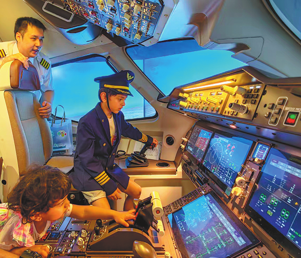 Young foreign students operate a C919 flight simulator at the Tianjin Huaxia Future Science and Technology Museum in Tianjin on Thursday. They are contestants on the fifth "Chinese Bridge" Chinese Show for Foreign Primary School Students.