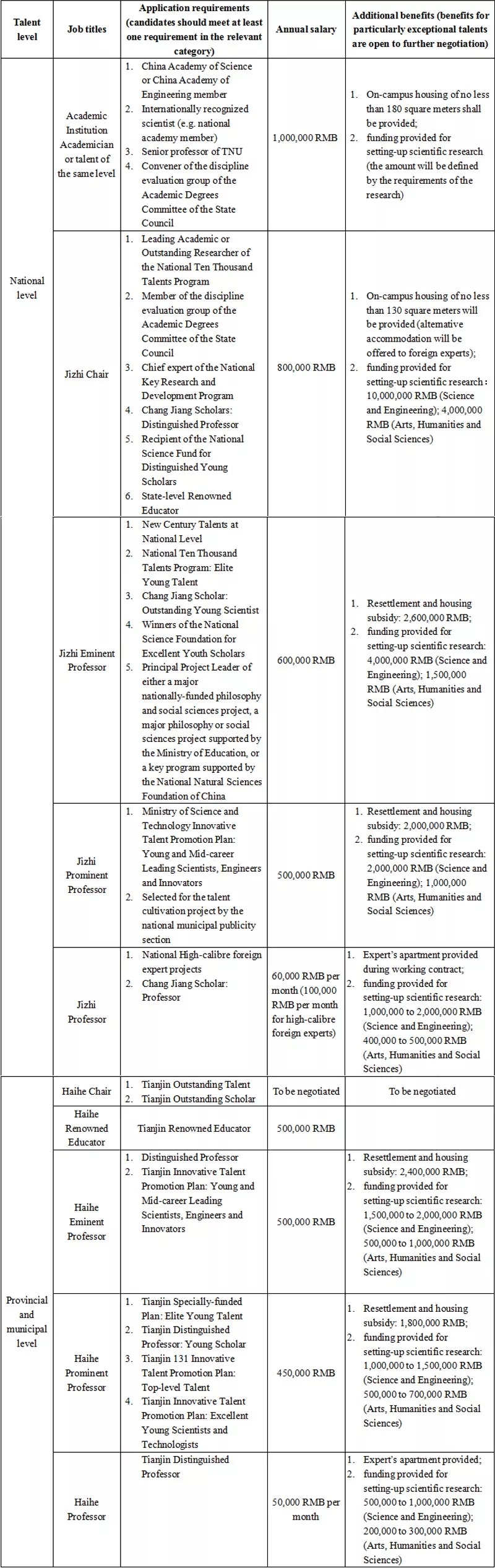 3. Top-level personnel who work in Tianjin for longer than six months will be granted a lump sum of 10,000,000 RMB as research funding and 2,000,000 RMB as a cost of living supplement; those who work in Tianjin for between two to six months will be granted a lump sum of 5,000,000 RMB as research funding and 1,000,000 RMB as a cost of living supplement.