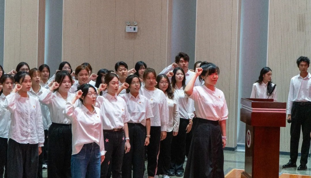 魏尚、孟小丽分别领誓,全体新发展党员、团员握紧右拳,面向党旗、团旗,郑重宣誓。当“我志愿加入中国共产党”的誓词响起,在场的学子心潮澎湃。