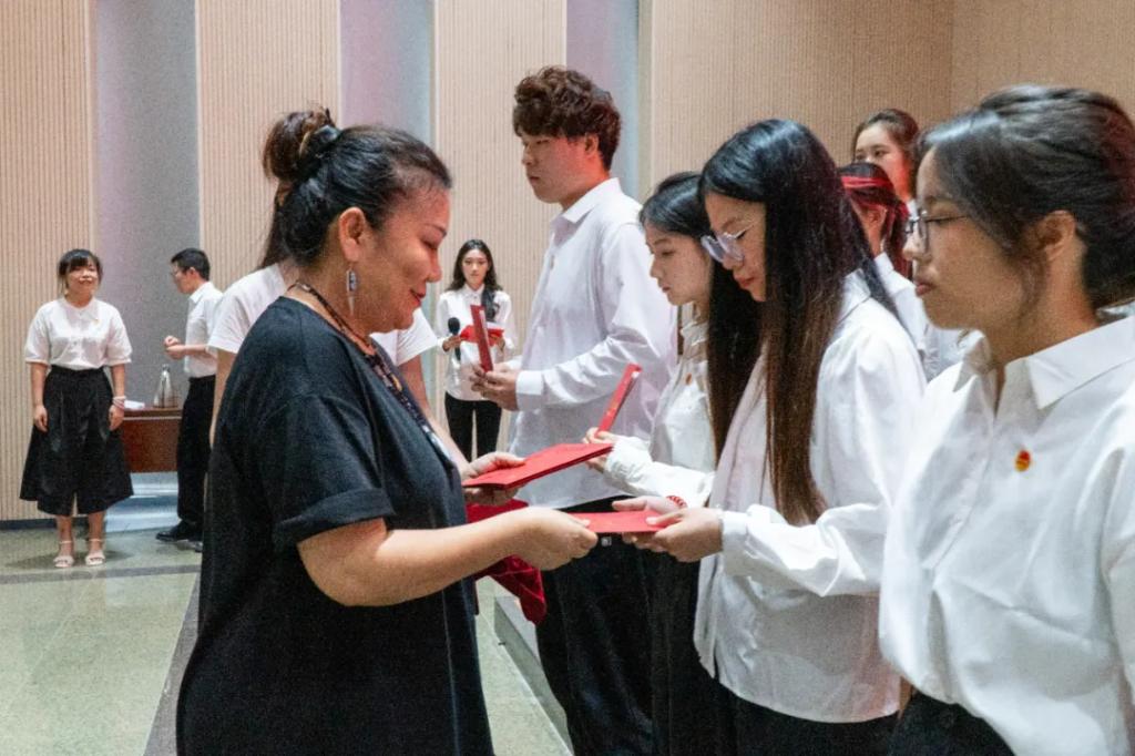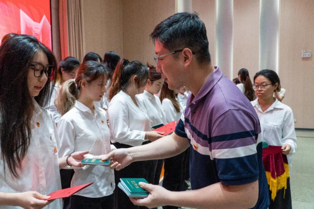 出席仪式的领导老师为新党员佩戴党员徽章,并发放政治生日卡、党章;为新团员佩戴团徽,并发放团员证和团员生日卡。