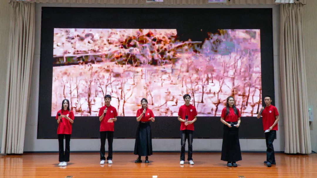 2418班王韵然、王楚涵、张艺杨、陈棕熠、刘俊言、孙圣羿同学带来诗朗诵《百年风华正青春》。他们用铿锵有力又饱含深情的嗓音,讴歌革命先辈的坚定信仰与不朽功勋,展望新时代青年接力奋斗、开创未来的壮志豪情。