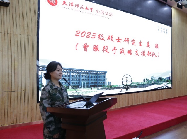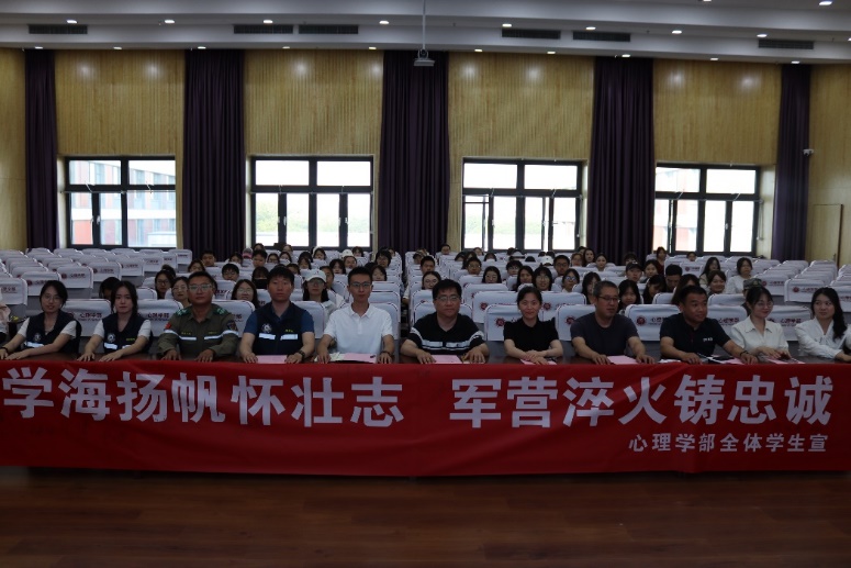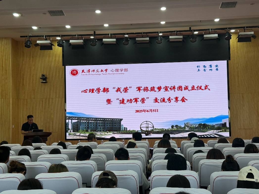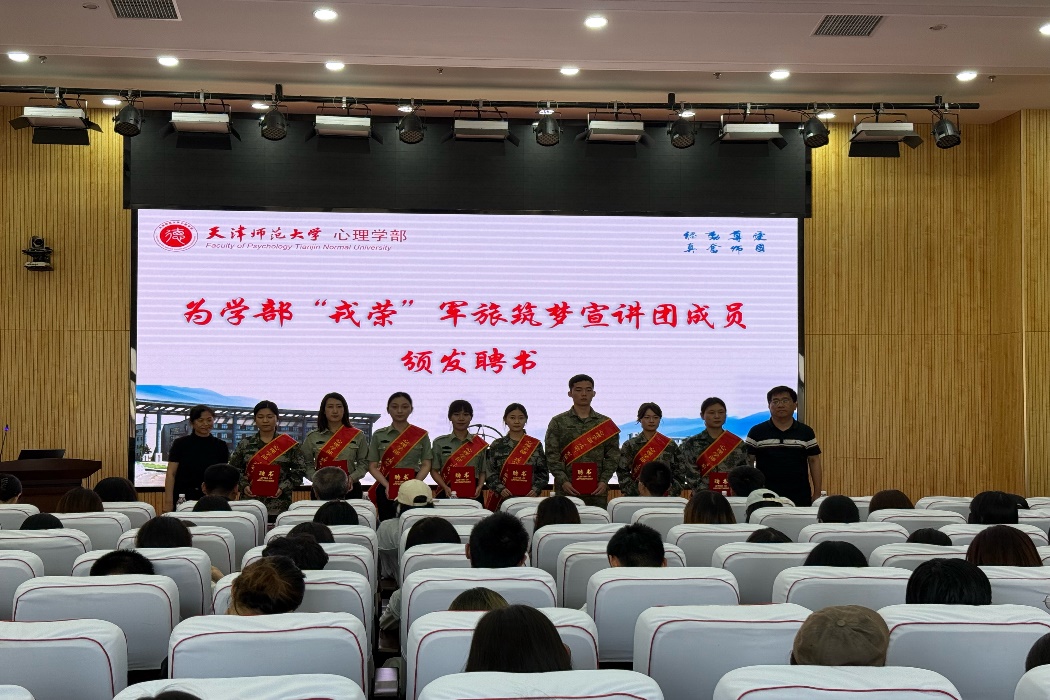 本站讯(通讯员 于海涛)6月5日下午,心理学部“戎荣”军旅筑梦宣讲团成立仪式暨“建功军营”交流分享会在励志楼F408举行。校人民武装部部长宁睿英,心理学部党委副书记、纪委书记米溢,校人民武装部干事焦志麒,天津市青联委员、蓝星应急救援队队长王梓旭,青年分队队长张瑞翀、退役军人分队队长张超出席仪式,学部全体团干部及学生代表100余人参加活动。