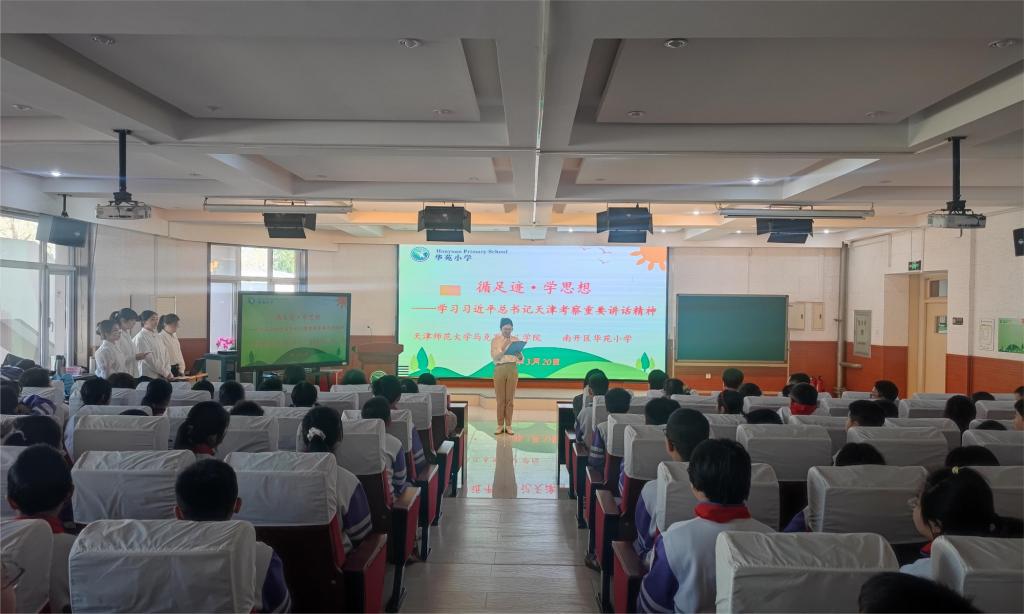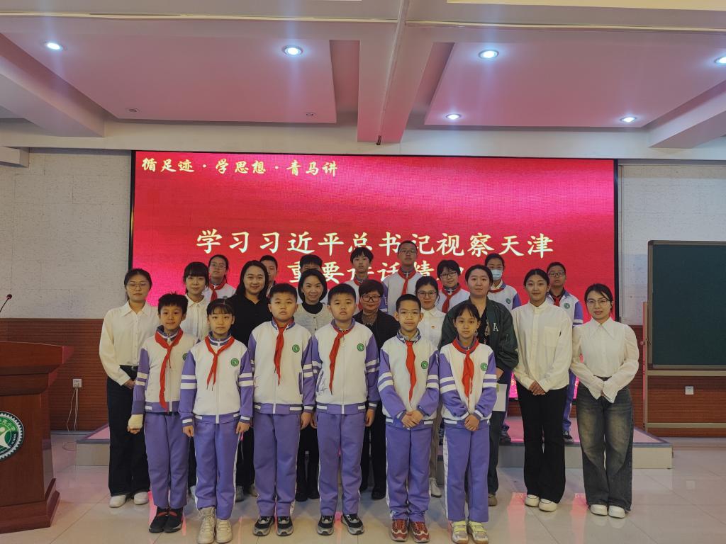 签约仪式后,马克思主义学院学生理论宣讲团进行“循足迹·学思想·青马讲”主题宣讲,宣讲团成员沿着习近平总书记视察天津的足迹,结合自身实践经历和学习感悟,从“乡村振兴—中国式现代化的必由之路”“今时津味,文化促新”“牢记领袖嘱托,站稳人民立场”三个篇章出发,将习近平总书记视察天津重要讲话精神融入小学生能听懂、喜欢听的故事之中。参加活动的同学们纷纷表示,作为新时代的好少年,要牢记习近平总书记的嘱托,接好手中的接力棒,继承先辈遗志,刻苦学习、强健体魄,努力成为一名合格的社会主义建设者和接班人。
