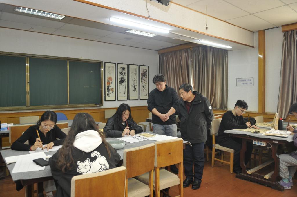 在书法教室,王润昌、康国林从书法临帖、选帖等基础知识入手,指导同学们如何写出有生命的书法作品。随后,两位老师现场挥毫泼墨,从技法上进行详细讲解,师生们认真临摹,仔细聆听,与名家一起沉浸在笔墨的馨香里。