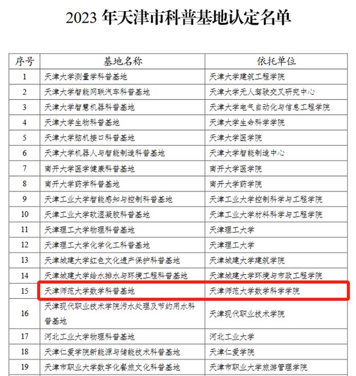 数学科学学院消息(通讯员 郭小玮)近日,在学校的大力支持、科技处等职能部门的精心指导下,我校数学科学学院申报的数学科普基地成功入选2023年天津市科普基地。