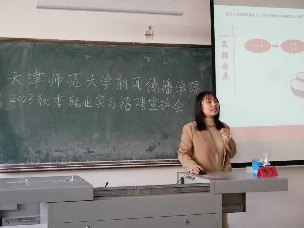 老美华创立于1911年,是响彻津门的百年品牌。现就职于公司的新闻传播学院2017级毕业生金鑫鑫为同学们详细介绍了老美华品牌的历史沿革、企业文化、招聘需求,以传统与科技相结合、新媒体平台宣发等就业前沿视角与同学们展开互动交流,鼓励大家投递简历,积极就业,勇敢追求自己的热爱。
