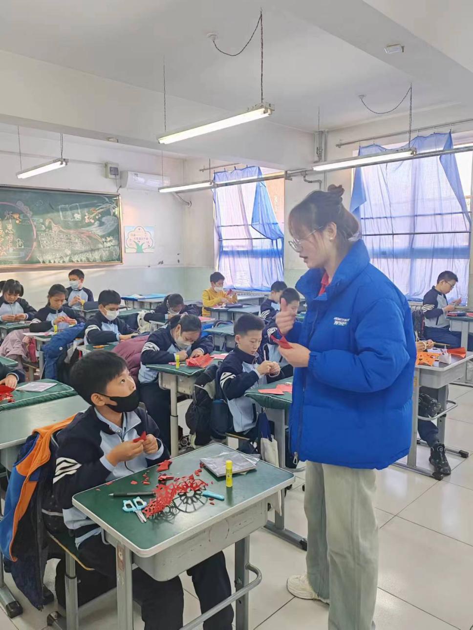 在《妙剪生花》课堂上,志愿者们为同学们普及了“剪纸文化”在实际生活中的应用场景以及剪纸艺术的由来和发展历史,随后带领小朋友们一起完成剪纸作品创作,让大家在实操过程中沉浸式感受中华传统文化的魅力所在。