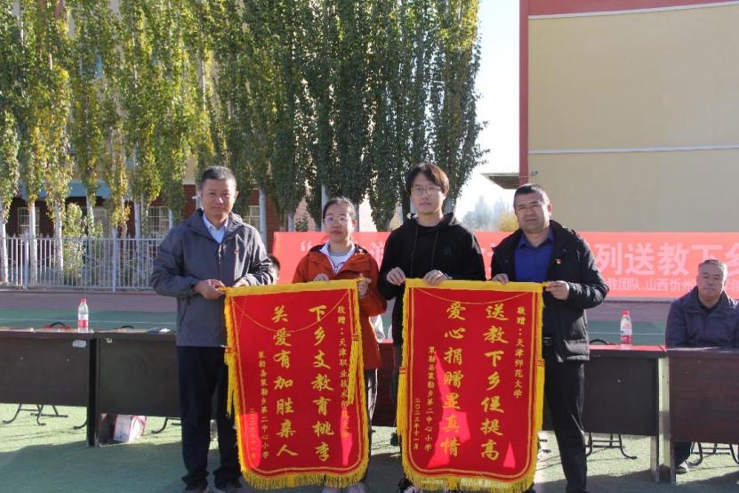 支教团为小学生送上丰富的科学实验套装、彩笔等礼物,希望他们努力学习科学文化知识,用自己的双手绘制出未来的精彩人生。策勒县教育局及受捐学校为师生赠送锦旗表达由衷的敬意和感谢。