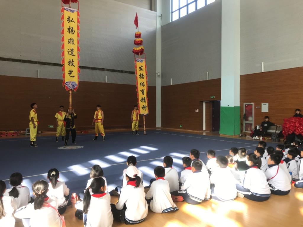 体育馆中,同学们在参观我校体育设施、聆听优秀大学生健儿骄人战绩后,近距离欣赏了由体科院学生表演的中华非物质文化遗产“宫前中幡”和舞狮,感受中华非遗的独特魅力,增强中华传统文化的自信认同。