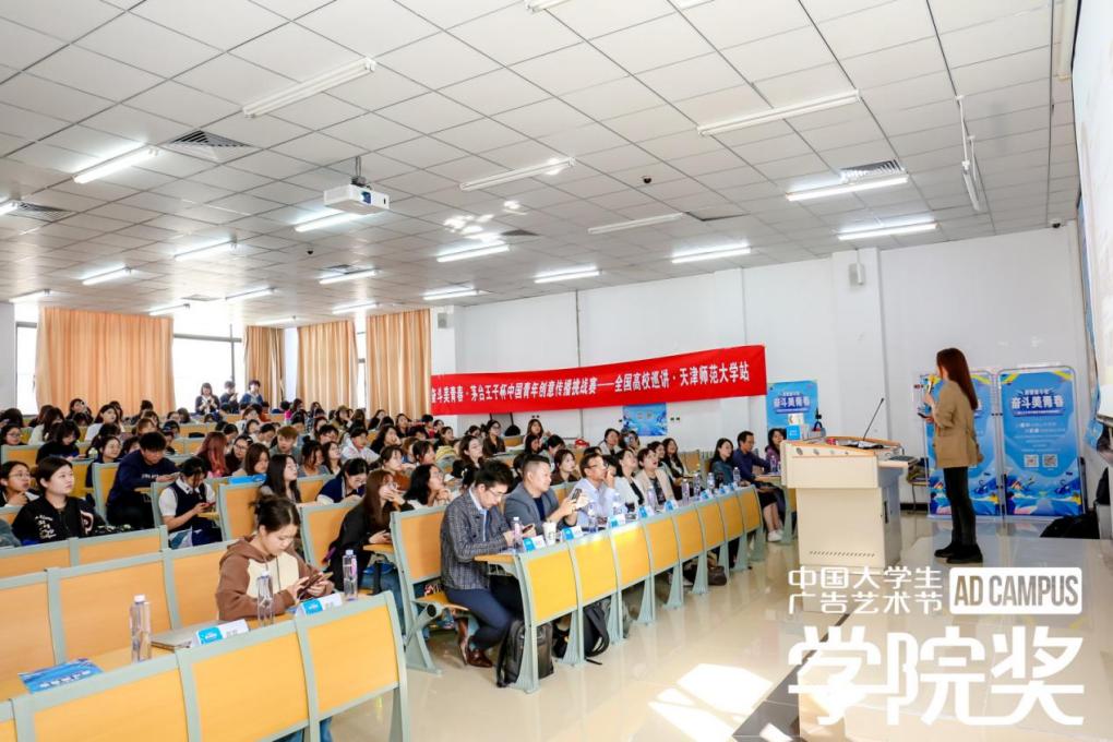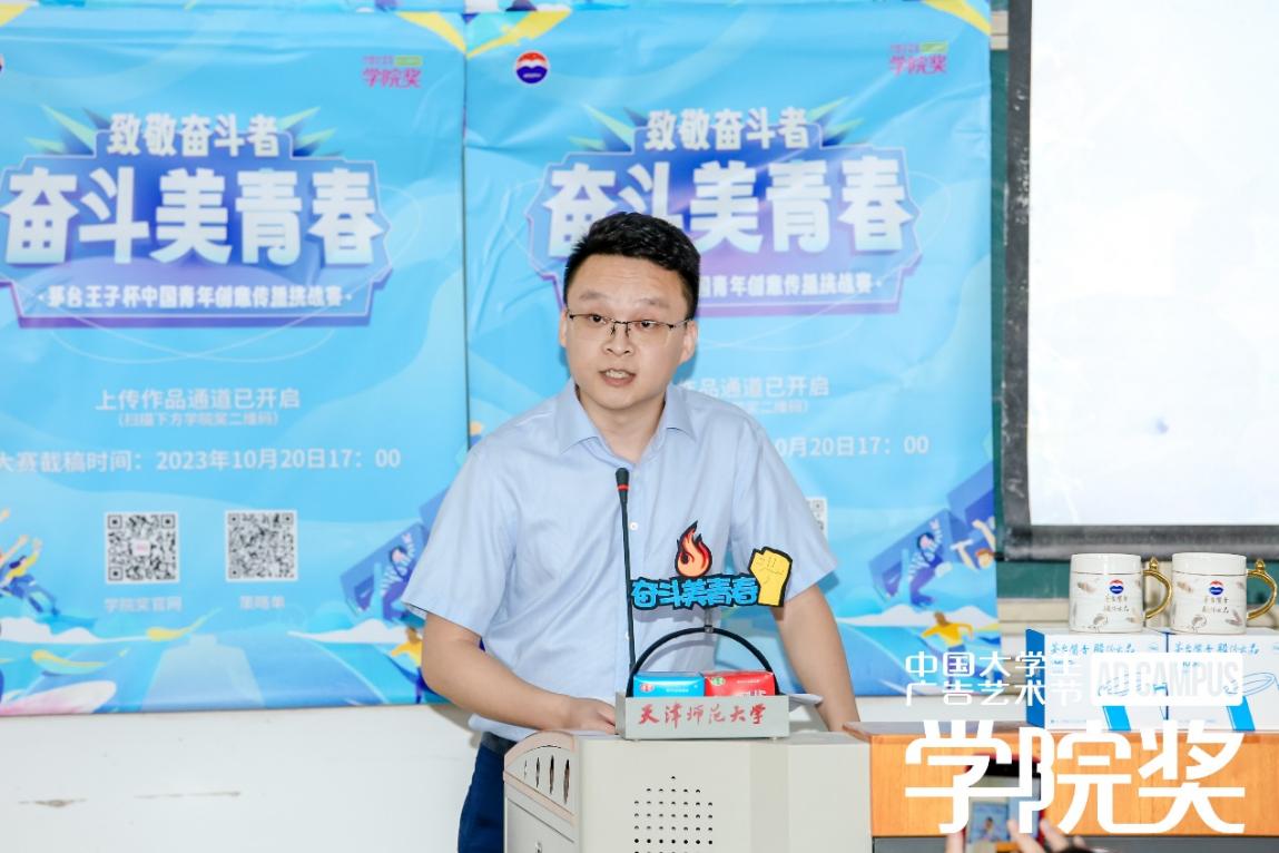 新闻传播学院消息(通讯员 高宇)近日,由中国大学生广告艺术节学院奖主办,贵州茅台酱香酒营销有限公司和我校新闻传播学院联合承办的“奋斗美青春·茅台王子杯大赛”高校巡讲在劝学楼B区511室举行。大广节学院奖组委会代表陈晓庆、周顺芝,贵州茅台酱香酒营销有限公司天津省区经理郑鑫,时趣集团高级副总裁柴耿琦,耐特康赛CTO兼首席咨询师郭庄,学院党委书记滕杰、广告学系部分师生及美术与设计学院师生代表200余人参加活动。