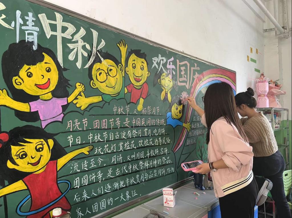 策勒分团成员跟随视频教学共同学习黑板报绘制方法,为所在支教学校绘制了一期以“浓情中秋 欢乐国庆”为主题的黑板报作品。支教团成员郑宇辉谈道:“这次制作黑板报的劳动实践让我们体会到劳动的快乐,作为支教大学生,我们更应该积极参与到日常劳动中来,同时也要不断培养孩子们的劳动意识和习惯,让他们认识到劳动的重要性。”