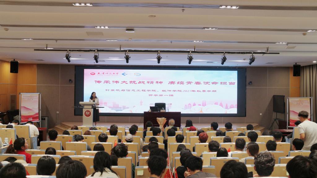 本站讯(通讯员 韩笑旭 潘晓雯)为铭记历史,传承伟大抗战精神,增强青年学生的爱国情怀和使命担当,9月18日下午,计算机与信息工程学院、软件学院在京津冀协同创新中心B座一楼报告厅举行2025年秋季学期“开学第一课”主题活动。活动以“传承伟大抗战精神 赓续青春使命担当”为主题,邀请天津市军休干部关工委主任、天津市老战士宣讲团成员梁培国作专题报告。学院党委书记刘锋、纪委书记马昕,学生党员、入党积极分子代表及青马工程培训班学员共计190余人参加活动。活动由学院党委副书记曹陶科主持。