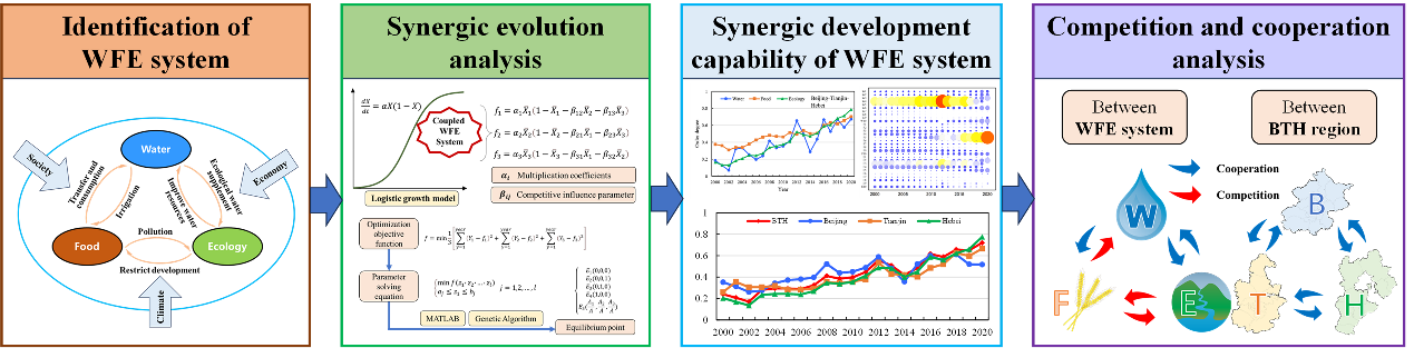 本研究从资源和效率两个维度构建了评价指标体系,通过整合WFE系统的有序度,提出了WFE协同发展能力指标(WFE-SDC),对京津冀WFE系统的可持续发展能力开展了多维、全面的定量评价;在此基础上构建了协同演化模型研究了京津冀WFE系统的竞争与协同演化机制。研究发现:(1)过去20年京津冀WFE系统可持续发展能力呈现波动变化,并由轻度功能失调衰退向中等协同发展逐步改善,而外调水量、生态用水量、粮食需求量、再生水使用量以及出境水量是京津冀WFE系统的主要障碍因子;(2)京津冀地区WFE系统呈现深度合作、强烈竞争的特征,并向协同发展方向演进,其中水系统作为协同发展的核心驱动力,在粮食系统和生态系统相互竞争的同时,支撑了两者的可持续发展;(3)京津冀三地在WFE系统发展中均表现出相互合作、相互促进的特点,且北京对天津、河北的发展起到了重要的促进作用,体现了三地协同发展的整体效果。