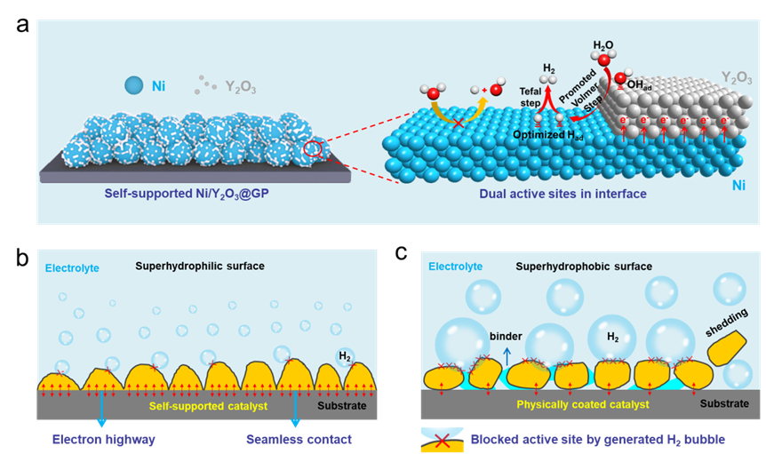图 电极的双功能活性位点协同催化机理、自支撑电极结构和超亲水界面调控示意图