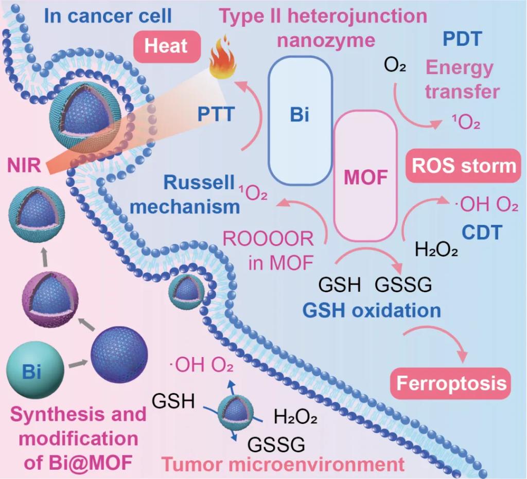 近日,我们成功构建一种具有核壳结构的异质结纳米酶应用于抗肿瘤治疗。这种核壳结构以Bi为核心,卟啉基双金属MOF为壳层,通过Bi@MOF异质结结构降低双金属卟啉基MOF材料产生光动力效应所需要的能量。Bi@MOF具有光热效应,并引发GSH耗竭诱导癌细胞铁死亡。同时,Bi@MOF异质结提升的光热动力效应能够与本身所具有的化学动力效应,最终实现PTT、PDT、CDT、铁死亡四种疗法的联合,为癌症光疗提供了新的研究范式。我们通过等离子体异质结促进的光热和光动力疗法联合纳米酶的多重活性,不仅成功实现了光热和光动力治疗一体化,还实现了基于GSH耗竭引发的铁死亡疗法和化学动力学疗法。最终形成了集光疗,生物通路触发等多路径多模态的抗癌疗法。