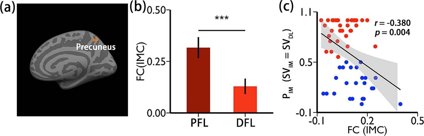 进一步PPI分析表明,负责价值计算的网络与动作抉择网络的功能耦合降低也是构成DFL的重要神经机制,并且功能耦合的降低程度可以直接预测个体的行为偏好水平(图2)。