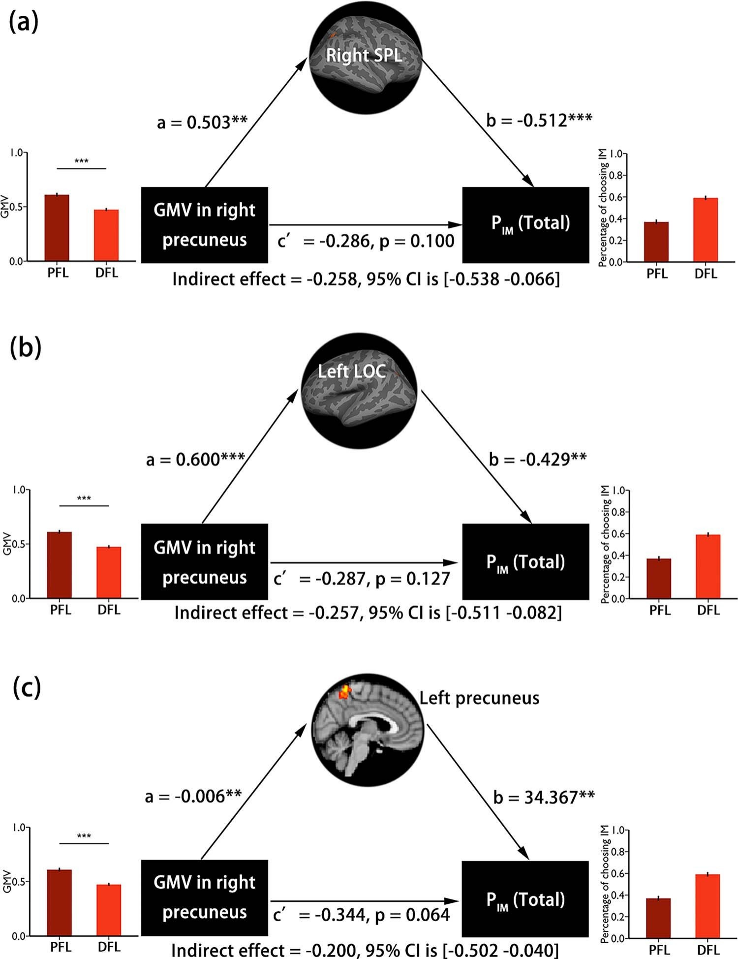 除了脑功能激活差异外,脑结构VBM分析表明,DFL 在右侧楔前叶表现出较小的灰质体积,并且右侧楔前叶的灰质体积通过调控负责价值计算和动作抉择的功能激活来改变个体决策偏好模式(图3)。