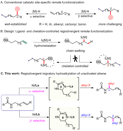 非活化脂肪烃C(sp3)-H键的选择性官能团化是有机合成化学中最具有挑战性的课题之一。在众多方法中,借助链行走的烯烃迁移氢官能团化反应是一种新兴的合成方法,该方法可以在远离初始烯烃位置的惰性C(sp3)-H上引入新的官能团。目前已报道的烯烃迁移官能团化反应中,反应主要发生在烯烃末端或吸电子基团(如芳基,硼酸酯,羰基,烯基等)的α位置(图1A),对于其他位点选择性的迁移官能团化反应还有待进一步研究。同时,从相同烯烃原料出发,通过不同位点的官能团化可以得到不同的区域异构体。因此,开发出一种区域选择性可控的迁移氢官能团化反应来制备结构多样化的分子是非常重要的。