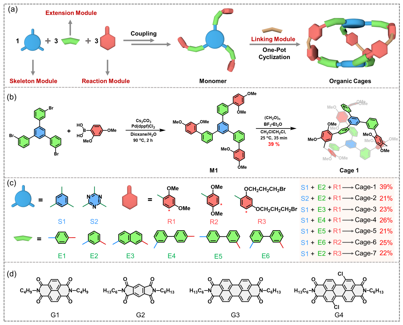 基于以上问题,该团队提出了一种“模块化定制合成共价有机分子笼的通用策略”。该方法包含4种模块,首先,1个中心骨架模块(S)与3个延伸模块(E)和3个反应模块(R)通过一步或两步简单的Suzuki−Miyaura偶联高效制备具有3个反应活性位点三角形单体,进而单体和连接模块多聚甲醛在Lewis酸催化下进行一锅Friedel–Crafts缩合,即可产生所设计的分子笼(图1)。研究发现单体结构中S–E–R连接的角度对成笼至关重要,只有S–E–R角度为120°且2,4-二甲氧基苯作为反应模块或60°且2,5-二甲氧基苯作为反应模块时才能成功获得分子笼。通过合理的设计几种模块,成功获得一系列具有不同功能骨架、空腔尺寸及电性的共价有机笼,并获得2个分子笼的单晶结构,实现共价有机笼的可定制合成。此外,中性主体在有机相中高效识别中性客体是十分困难且具有挑战性的,典型的中心骨架电性不同的分子笼分别对缺电子的中性芳香二亚胺(G1‒G4)表现出强的键合能力,在极性溶剂最高键合常数达105 M−1,驱动力主要是疏溶剂效应和电荷转移作用。该工作为化学稳定的共价有机笼的合成及功能材料的设计提供了新思路和新方法。