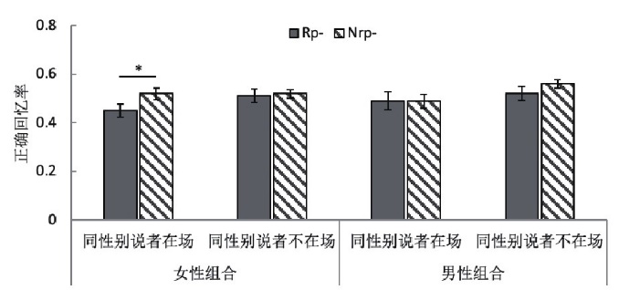 图1 不同性别组合中,听者在不同互动水平下对Rp-和Nrp-项目的正确回忆率(*p < 0.05)