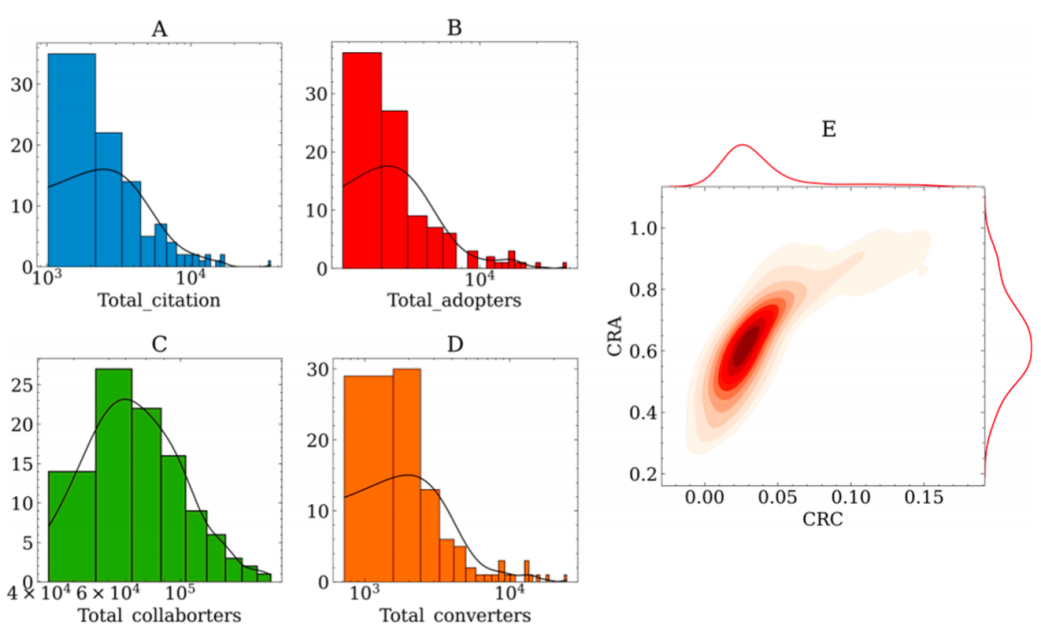 为探究这些问题,研究团队开创性地将“集体记忆理论”与“创新扩散理论”相融合,构建了基于引用的科学创新集体记忆网络,并在网络中定义了四类作者角色:原作者、采纳者、合作者和转化者。同时,研究引入了两个新的定量指标——采纳者转化率 (CRA) 和合作者转化率 (CRC),用于衡量合作网络中知识传递的效率。通过对引用模式、合作网络及转化率的综合分析,团队揭示了科学创新在合作网络中的传播路径与内在机制。