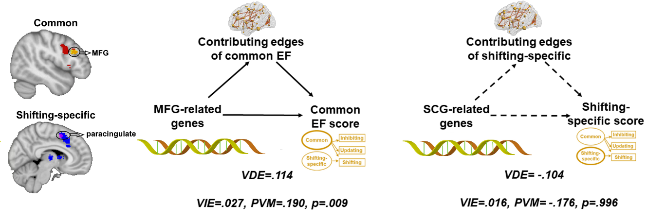 上述结果显示"C+S"模型中的成分在行为、神经和基因水平上是分离的。在最后的分析中,作者应用了高维中介模型来进行“基因-大脑-执行功能成分”通路分析。结果表明,在额中回表达增强的基因通过调节该脑区的功能连接进而影响执行功能共同成分的得分。