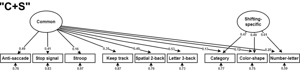 首先,为了全面考察EFs的结构,作者比较分析了基于三种最常讨论的EF成分(即抑制[I]、更新[U]和转移[S])的所有可能的12个候选模型,得到了五个具有良好拟合参数的模型。该结果不仅重复了之前受到广泛关注的两个模型:“抑制+更新+切换”模型(I+U+S),“共同+更新特异性+切换特异性”模型(C+U+S);而且拓展考察了由共同成分和一个特异性成分组成的模型,并且发现“共同+切换特异性”模型(C+S)拟合良好。