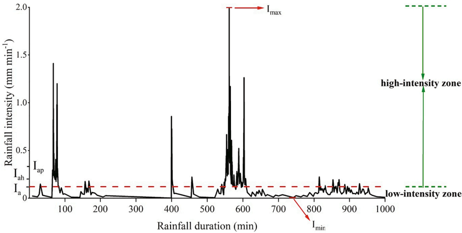 黄土高原是黄河泥沙的主要来源,严重的水土流失引起一系列生态环境和社会经济问题。降雨是引起黄土高原坡面水土流失的主要驱动力,以往研究通常只关注于降雨事件发生的降雨量、历时、平均雨强和最大30min雨强等常规特征对产流和产沙的影响,忽略了降雨过程中雨强的波动特征对水土流失的影响。随着气候变化加剧,导致强降雨事件频发,降雨强度波动特征的复杂性成为制约降雨与水土流失关系研究的热点和难点问题。为此,本研究在黄土高原地区开展野外水土流失观测实验,通过解析降雨事件雨强波动过程(图1),建立了一系列降雨强度波动特征指数,从而量化降雨强度波动特征对水土流失的影响。
