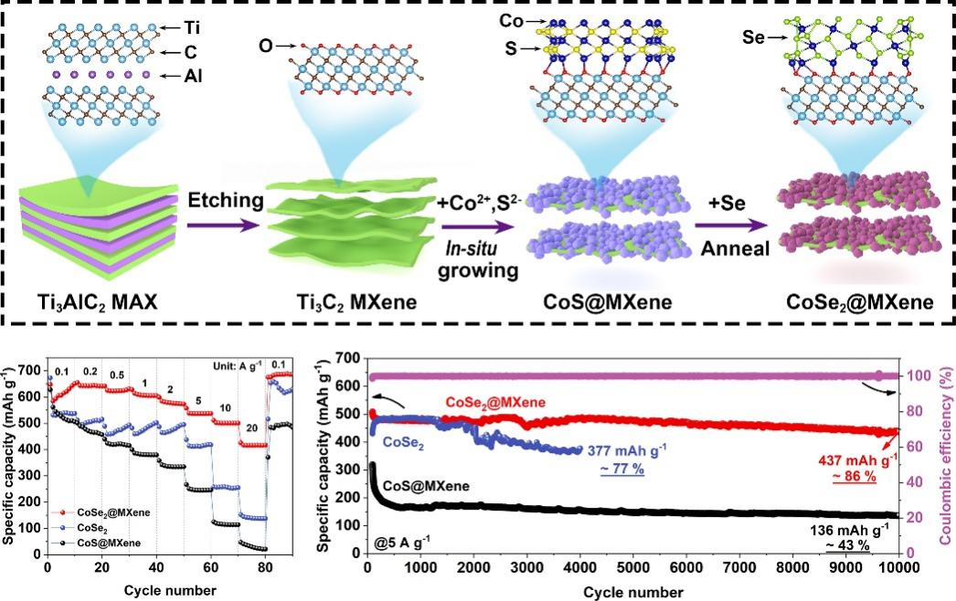 CoSe2@MXene复合材料的合成示意图和电化学性能图