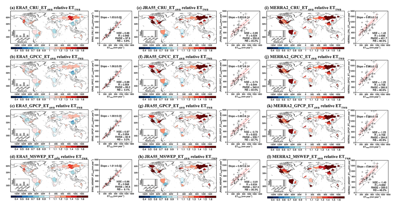 利用团队前期建立的全球流域尺度水量平衡蒸散发数据集,研究人员系统评估了大气水量平衡法估算全球陆地蒸散发的精度。结果表明,基于欧洲中尺度天气预报中心的ERA5再分析数据得到的大气水汽辐合和大气水汽含量变化和四种全球降水数据计算得到的蒸散发精度远高于基于日本气象厅的JRA55和美国宇航局的MERRA2再分析数据计算得到的结果。JRA55和MERRA2得到的结果普遍高估陆地蒸散发,特别是在高纬度地区,这可能是由于ERA5表达的风速和比湿的精度更高,从而计算的大气水汽辐合更加合理。