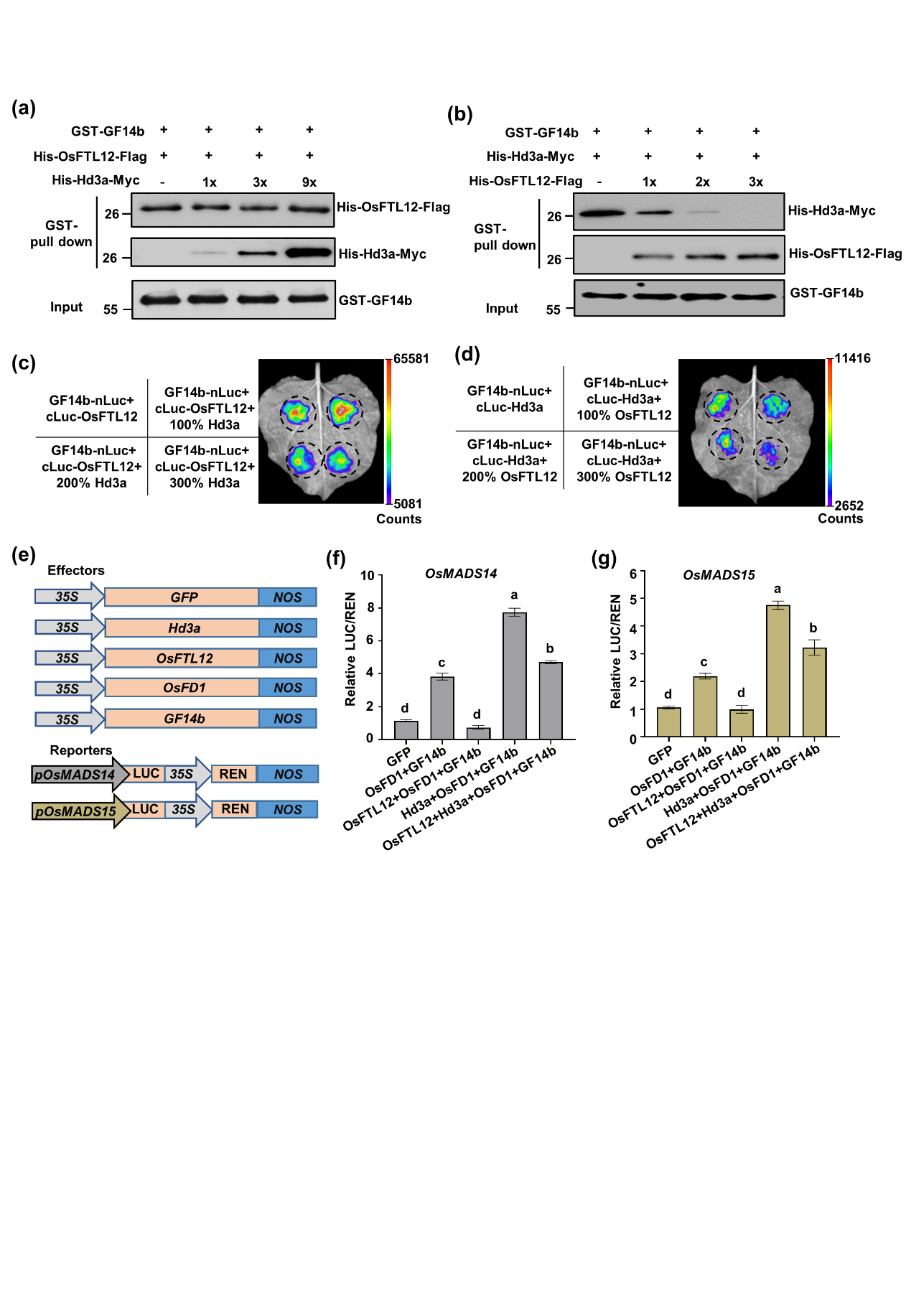 2:OsFTL12Hd3a竞争结合GF14b形成FRC并抑制开花特征基因的启动子