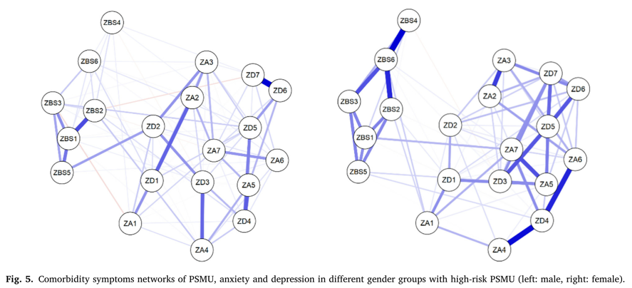 社交媒体成瘾的大学生常常存在焦虑、抑郁等心理问题,并且不同性别个体可能存在不同的成瘾行为特征。不同性别的社交媒体成瘾、焦虑与抑郁症状网络结构是否存在差异是行为成瘾研究领域中一个值得研究的重要问题。为了对该问题进行检验,需要突破以往较为常用的相关分析方法。杨海波教授等借鉴Borsboom(2017)在精神病理学研究领域中的网络分析模型(Network theory),对大学生的社交媒体成瘾、焦虑与抑郁的共病症状网络进行分析,并比较了症状网络的性别差异。在网络分析中,症状被概念化为节点与网络。社交媒体、焦虑与抑郁的共病症状网络显示了不同症状对大学生成瘾行为、焦虑与抑郁情绪的重要性,也指出了各症状间的相互联系。